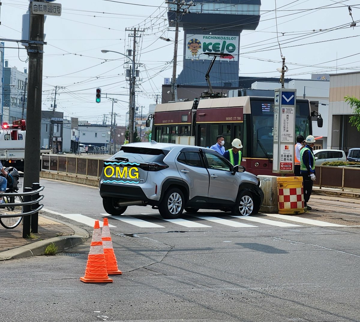 【現場の様子】#交通情報 北海道函館市湯川町 #函館市電 函館アリーナ前停留場付近に自動車突っ込む事故で車線規制渋滞7月17日 #渋滞 #北海道 #函館 #市電