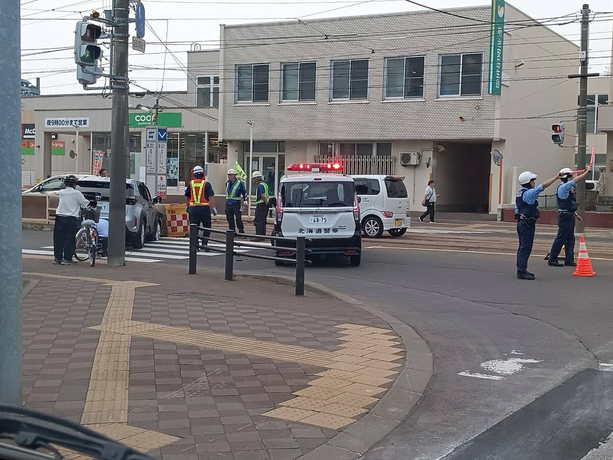 『函館アリーナ前の電停で事故が起きて湯の川温泉方面に行けない通行止めです』