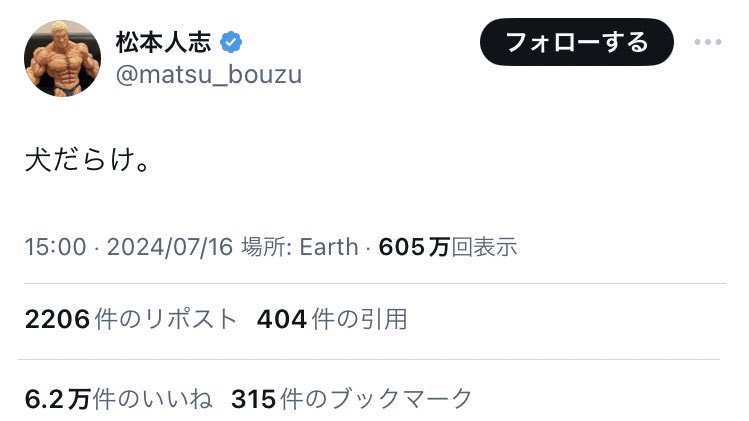 【悲報】松本人志さん、X再開で媚びてくる後輩芸人達に痛烈な一言wwwwww 2024/7/18 速報 1: document.write(” + ”); 関連記事 document.write(” + ”); 続きを読む ——— Source: アルファルファモザイク 【悲報】松本人志さん、X再開で媚びてくる後輩芸人達に痛烈な一言wwwwww