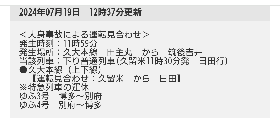 久大本線で人身事故発生。 pic.twitter.com/9lKMoVKQSN