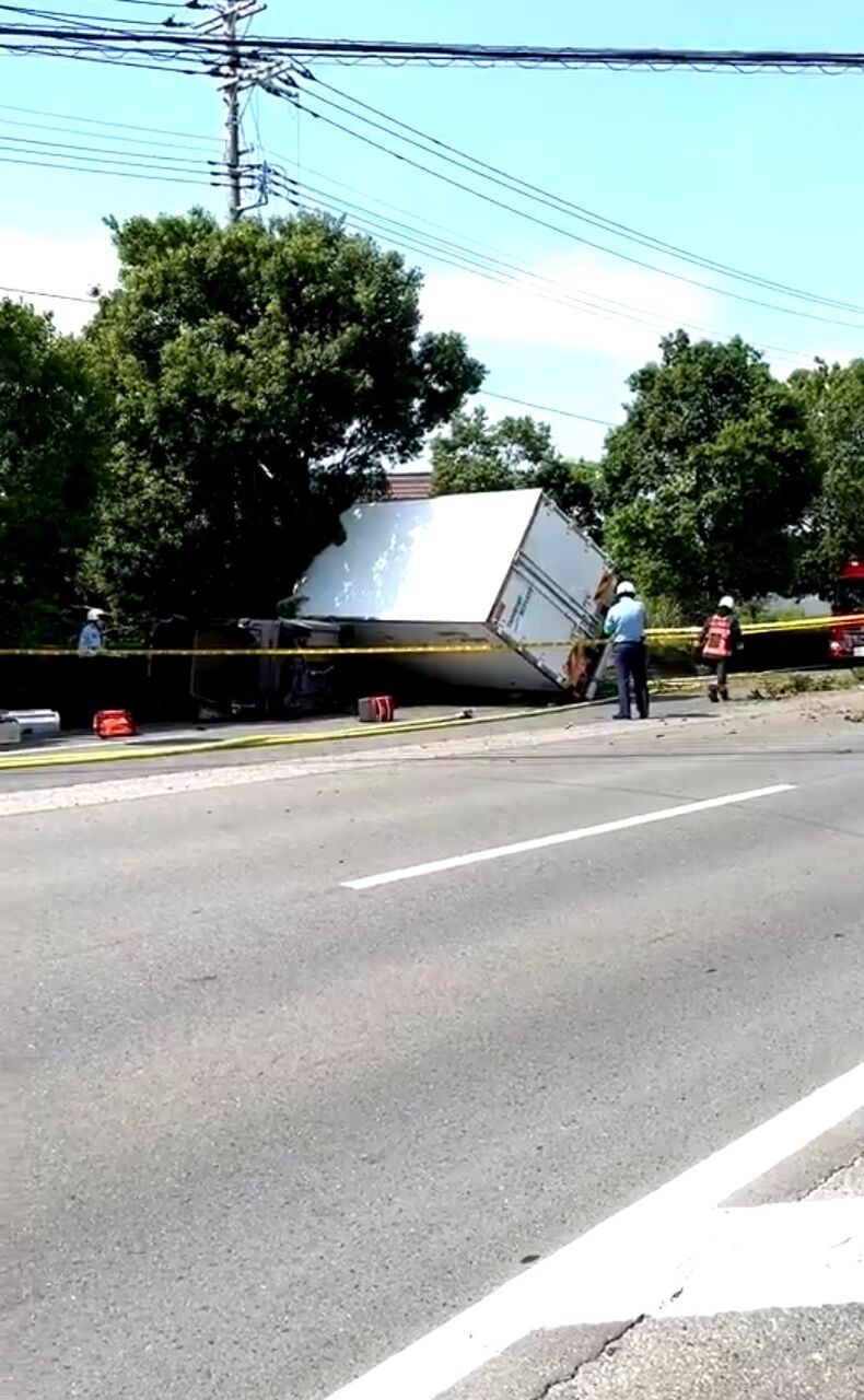 『茨城県常総市の294号線で3台が絡むトラックの横転事故が発生して大渋滞となっています!