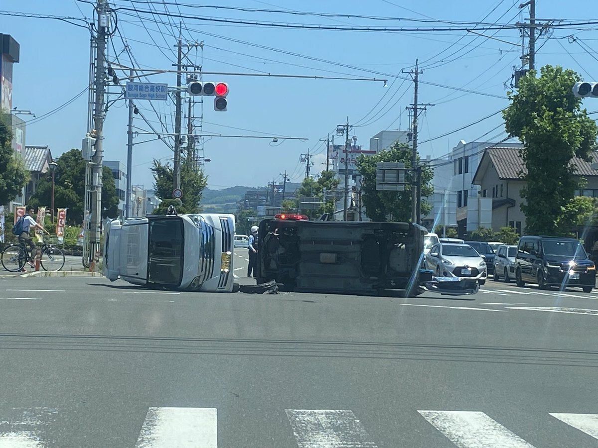 『駿河総合高校前で車横転してます