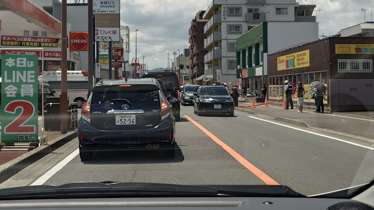 【現場の様子】#交通情報 福大通り 福岡市城南区神松寺2丁目 標識なぎ倒しリサイクルショップに突き刺さる事故で規制渋滞7月23日 #福岡 #城南区