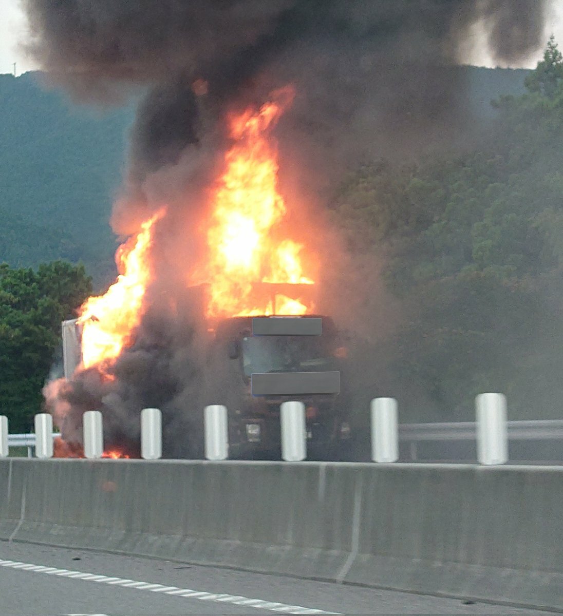 『新東名 新城付近で反対車線のトラック燃えてる。えらいこっちゃ』