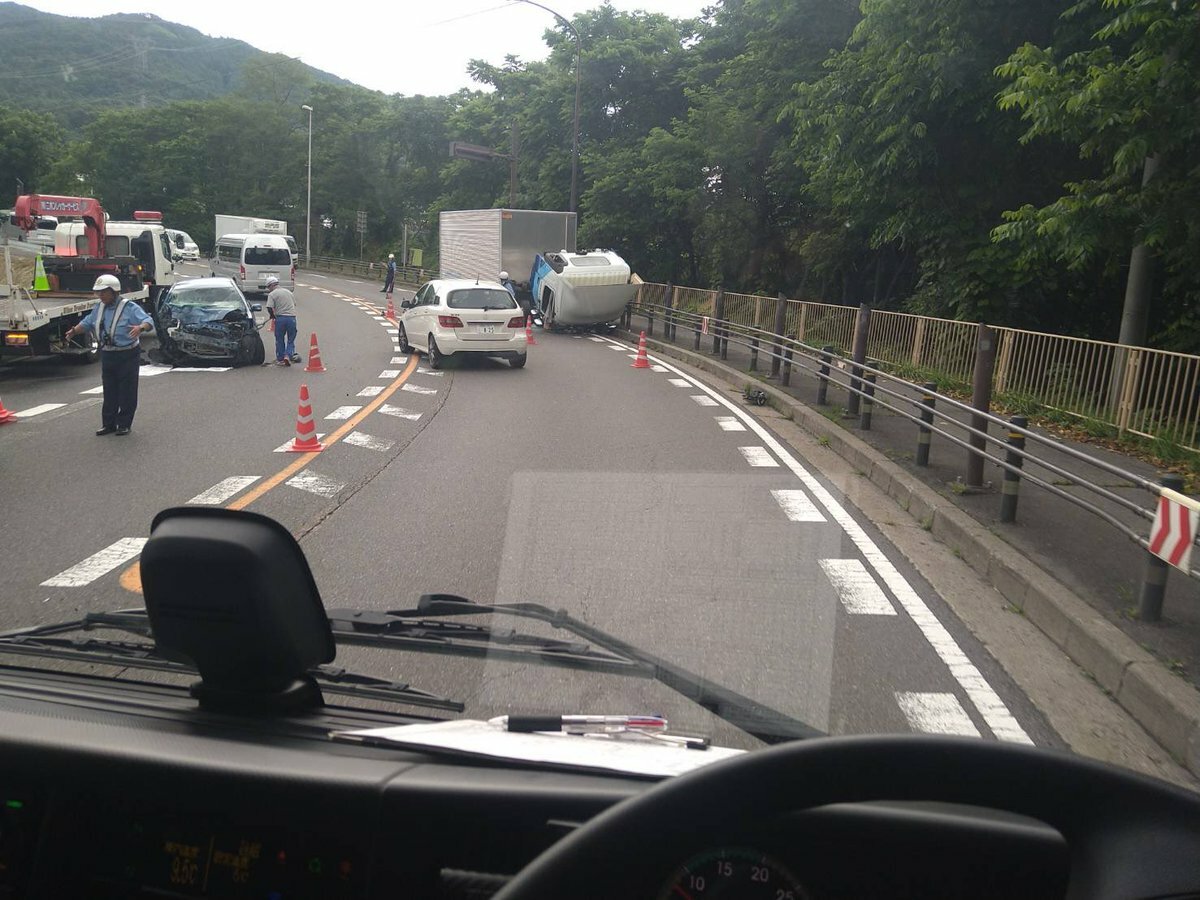 国道20号、塩尻市東山食堂前でトラックと乗用車の事故で片側通行のため大渋滞してます。レッカーに数時間は掛かると思われますので、迂回オススメします。#国道20号 #塩尻峠 #事故