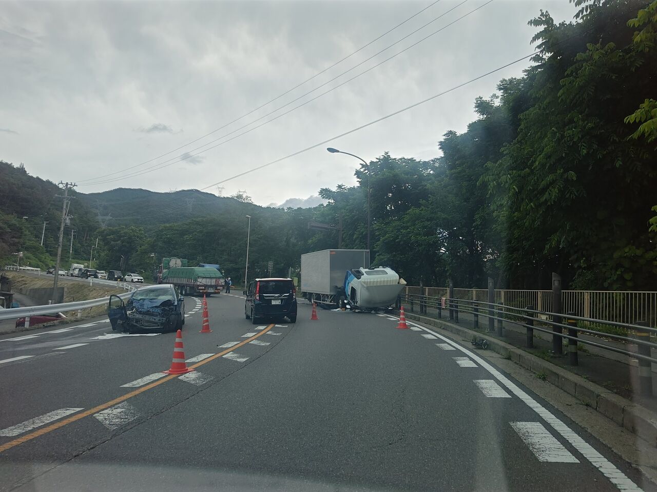 【現場の様子】#交通情報 #国道20号 長野県塩尻市東山食堂ヘアピンカーブ付近 トラックと乗用車の衝突事故で規制渋滞7月25日 #渋滞 #長野 #塩尻