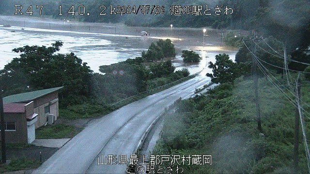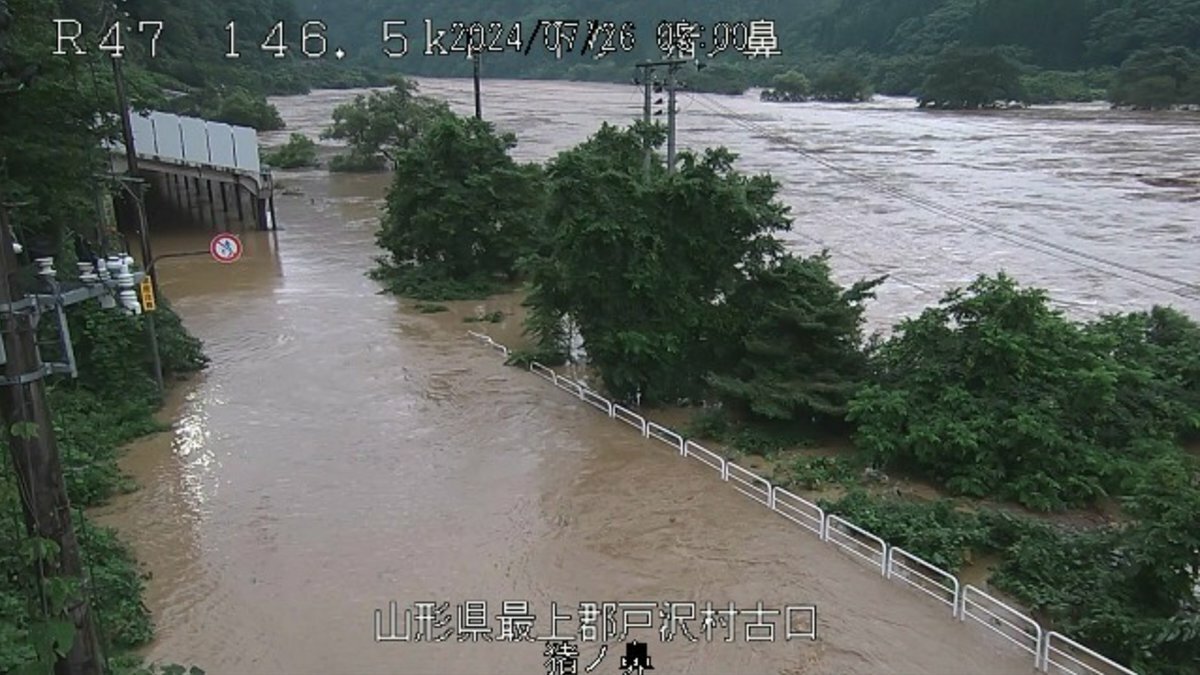 【現場の状況】#注意喚起 #最上川 中流の戸沢村蔵岡で越水氾濫 山形県酒田市の一部地域に緊急安全確保 国道47号線など通行止め7月26日 #山形 #酒田 #新庄 #線状降水帯