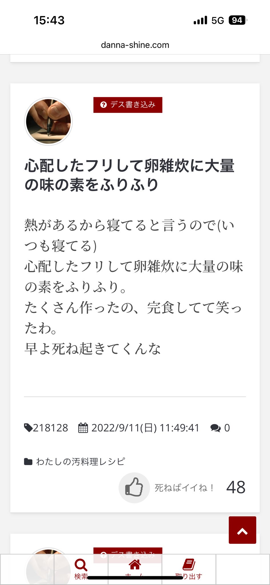 【悲報】夫デスノート「夫が体調悪いっていうから卵雑炊に味の素フリフリして出してやった!」 2024/7/29 速報 1: かわいい document.write(” + ”); 関連記事 document.write(” + ”); 続きを読む ——— Source: アルファルファモザイク 【悲報】夫デスノート「夫が体調悪いっていうから卵雑炊に味の素フリフリして出してやった!」