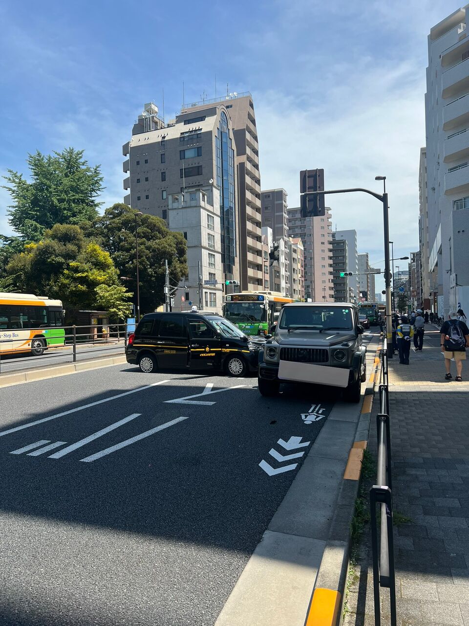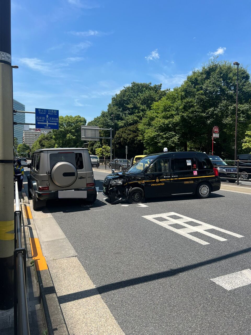 【現場の様子】#交通情報 目黒通り 東京都港区白金台5丁目交差点 目黒駅東側付近 車線塞ぐタクシーと乗用車衝突事故で規制渋滞 都バスなど遅延7月29日 #目黒 #白金高輪 #港区