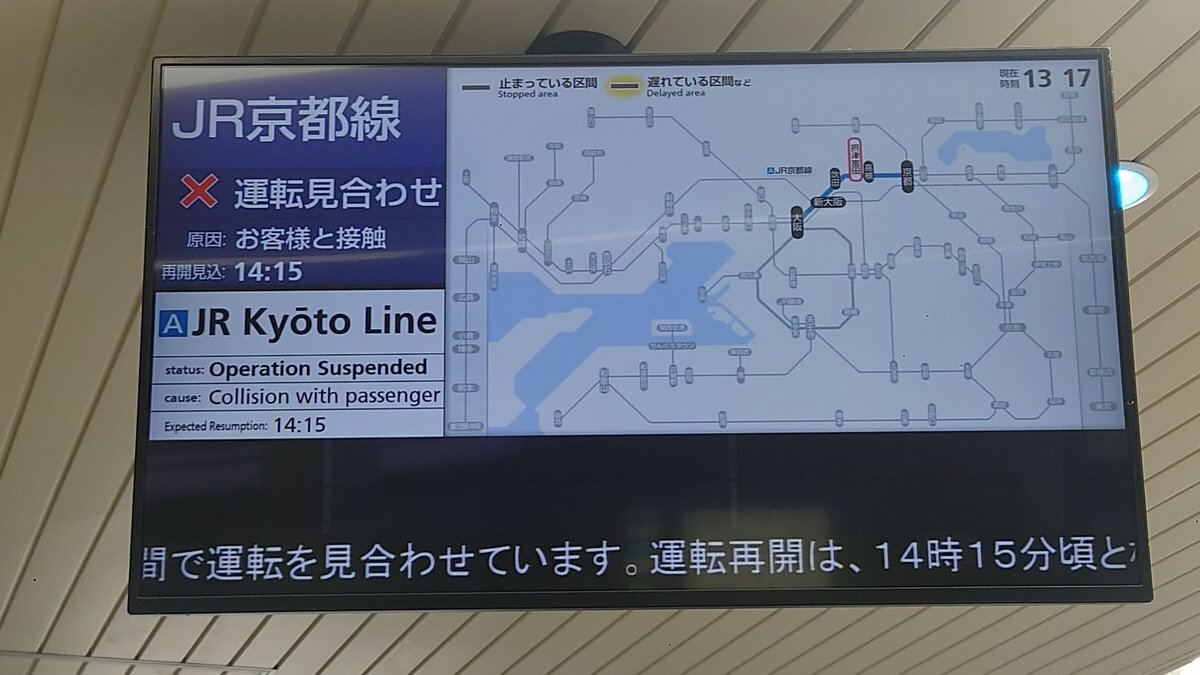 7月30日13時14分現在: 13時09分頃、JR京都線:千里丘駅で列車がお客様と接触したため、京都駅〜大阪駅間で運転を見合わせています。運転再開は、14時15分頃となる見込みです。 #JR西日本 #JR京都線 https://t.co/S3lsxSBSHi pic.twitter.com/SqNxOBlIPb