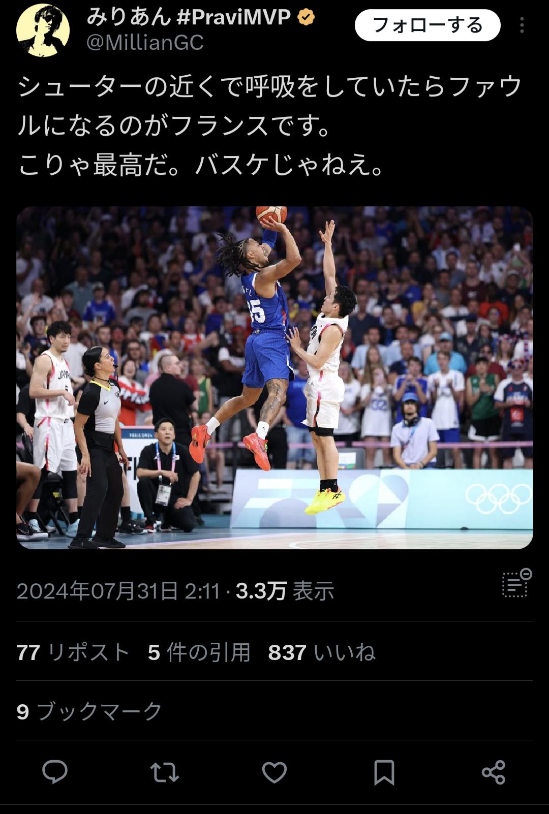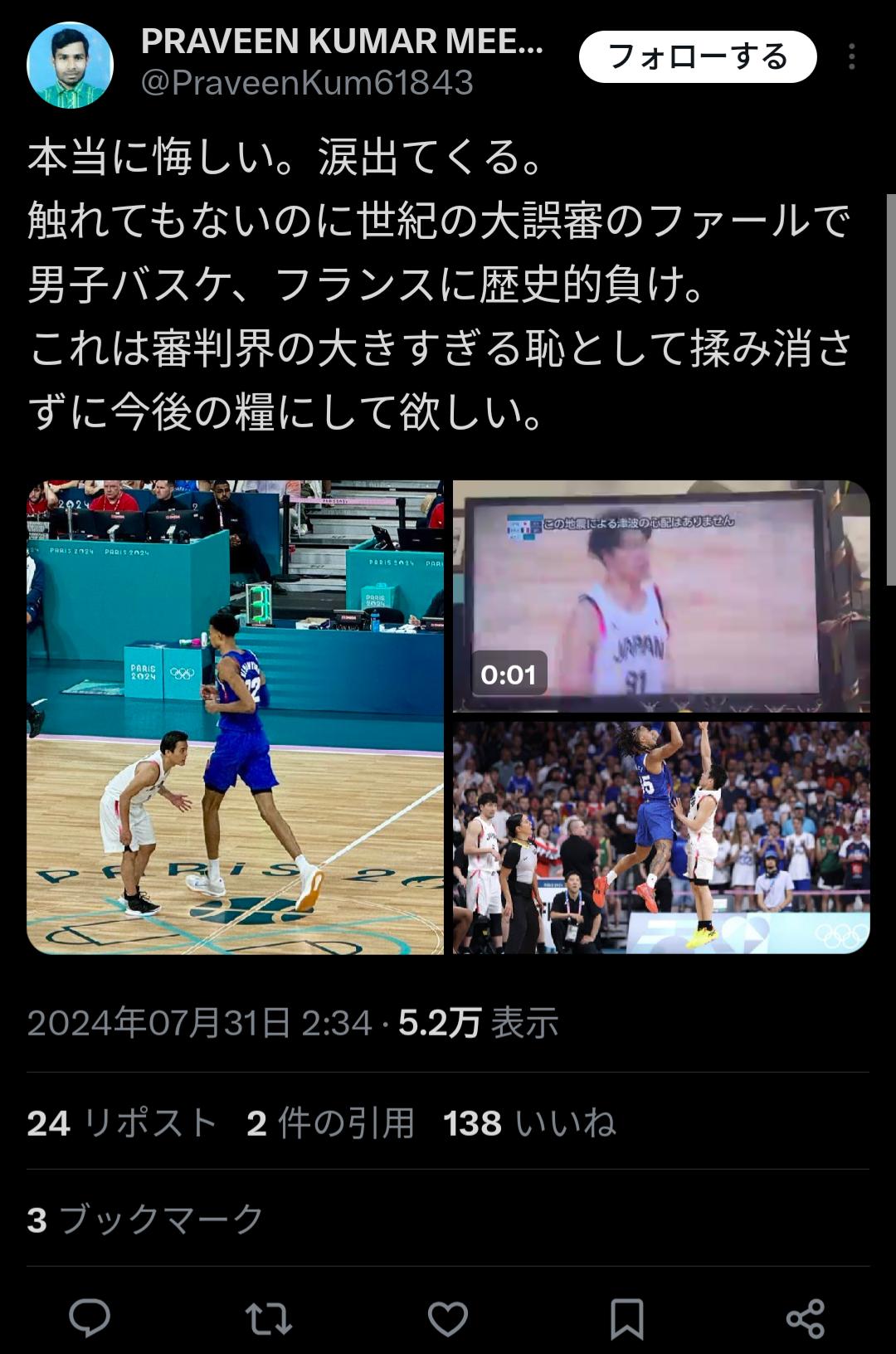 日本は開催国のフランスと対戦。完全アウェーの中、残り16秒の段階で4点リードを奪っていたが、延長戦の末に敗れた。4点リードで勝利は目前だった。だが残り10秒で相手にスリーポイントを決められ、河村勇輝のファウルも判定されてバスケットカウントを奪われた。フリースローを決められ同点。タイムアウトをとってラストワンプレーに勝負をかけたが、決めきれず延長戦へ突入し、結果として敗れた。