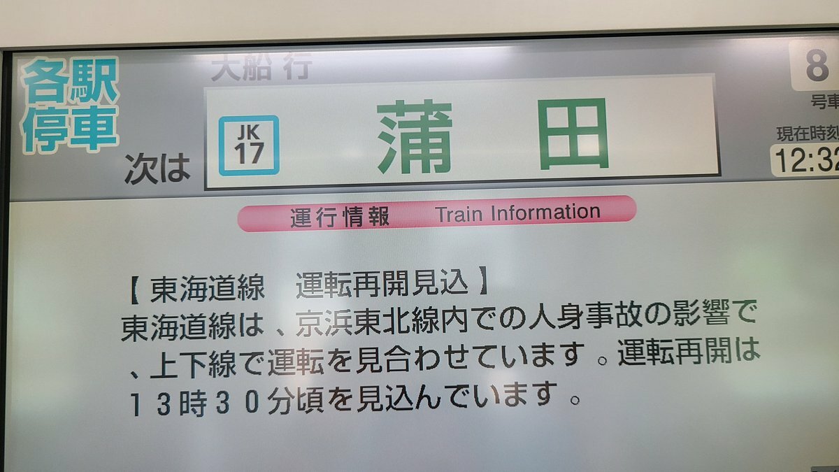 東海道線は、京浜東北線内での人身事故の影響で、上下線で運転を見合わせています。運転再開は13時30分頃を見込んでいます。 #東海道線 #Tokaido_Line https://t.co/LojididwyV— JR東日本【東海道方面】運行情報 (公式) (@JRE_F_Tokaido) July 31, 2024