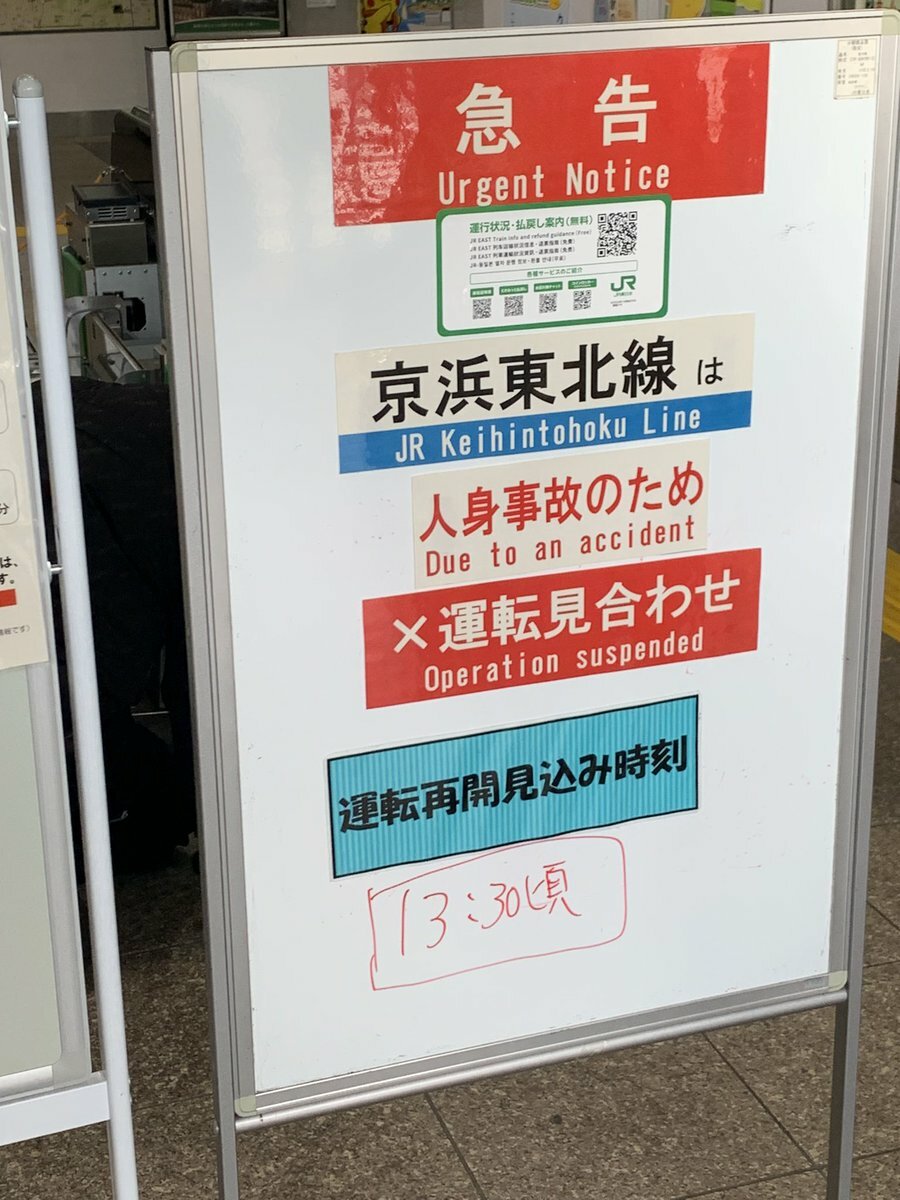 京浜東北線は、川崎〜蒲田駅間での人身事故の影響で、上下線で運転を見合わせています。運転再開は13時30分頃を見込んでいます。 #京浜東北線 #Keihintohoku_Line https://t.co/LojididwyV— JR東日本【東海道方面】運行情報 (公式) (@JRE_F_Tokaido) July 31, 2024