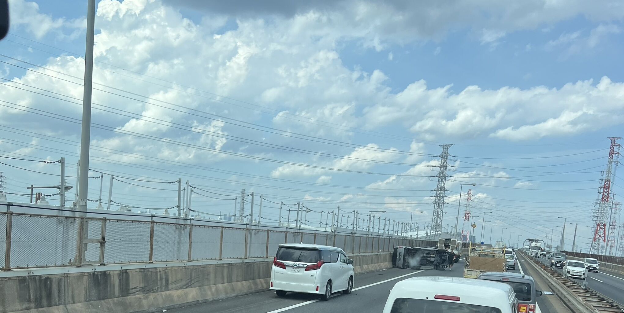 『外環外回りの新倉パーキングの真上で、ワンボックスが横転しとった!』
