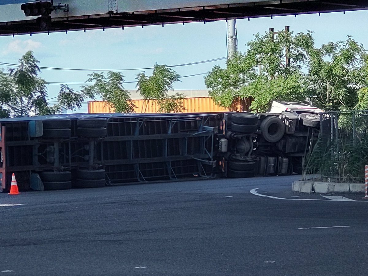 今飛島交差点で海コン横転してるんだが…