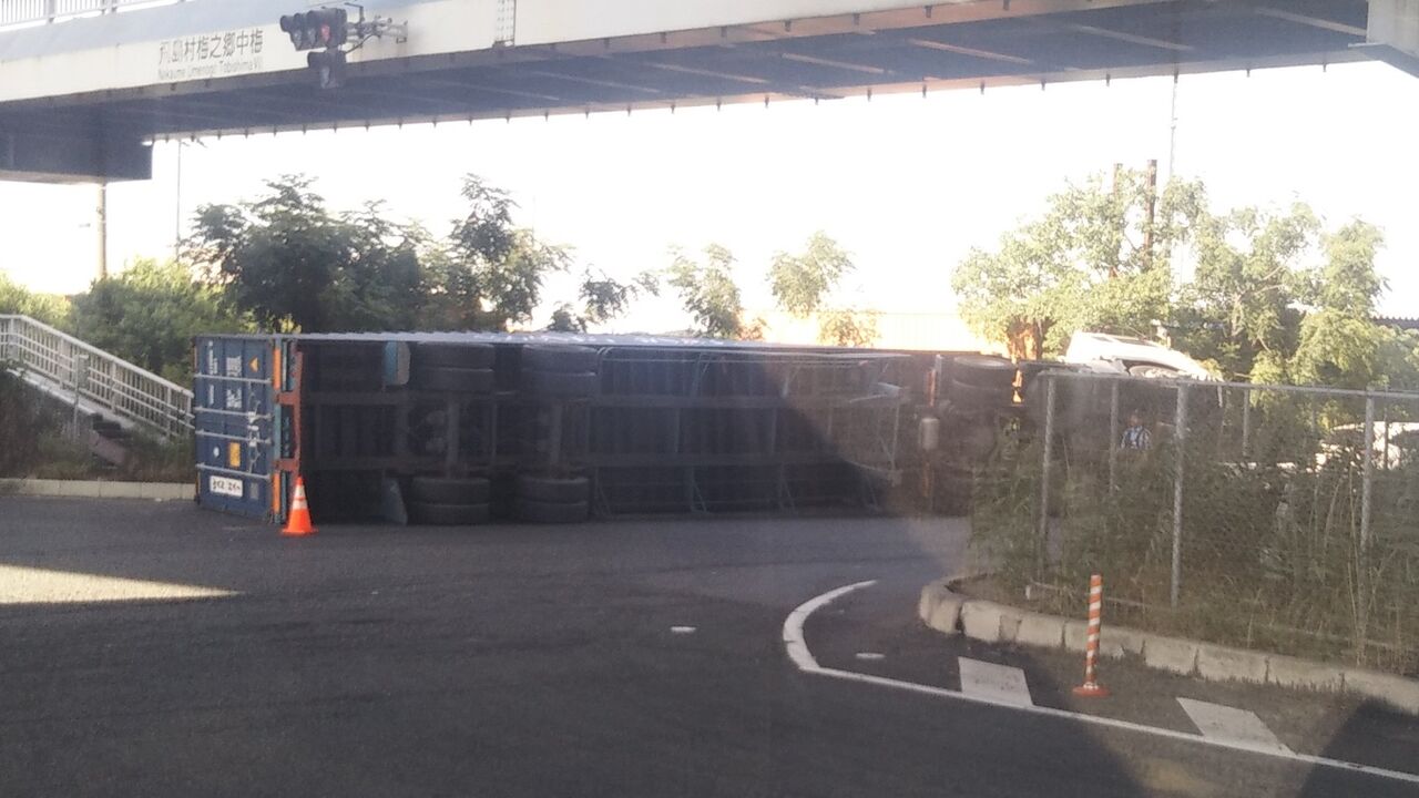 『今飛島交差点で海コン横転してるんだが』