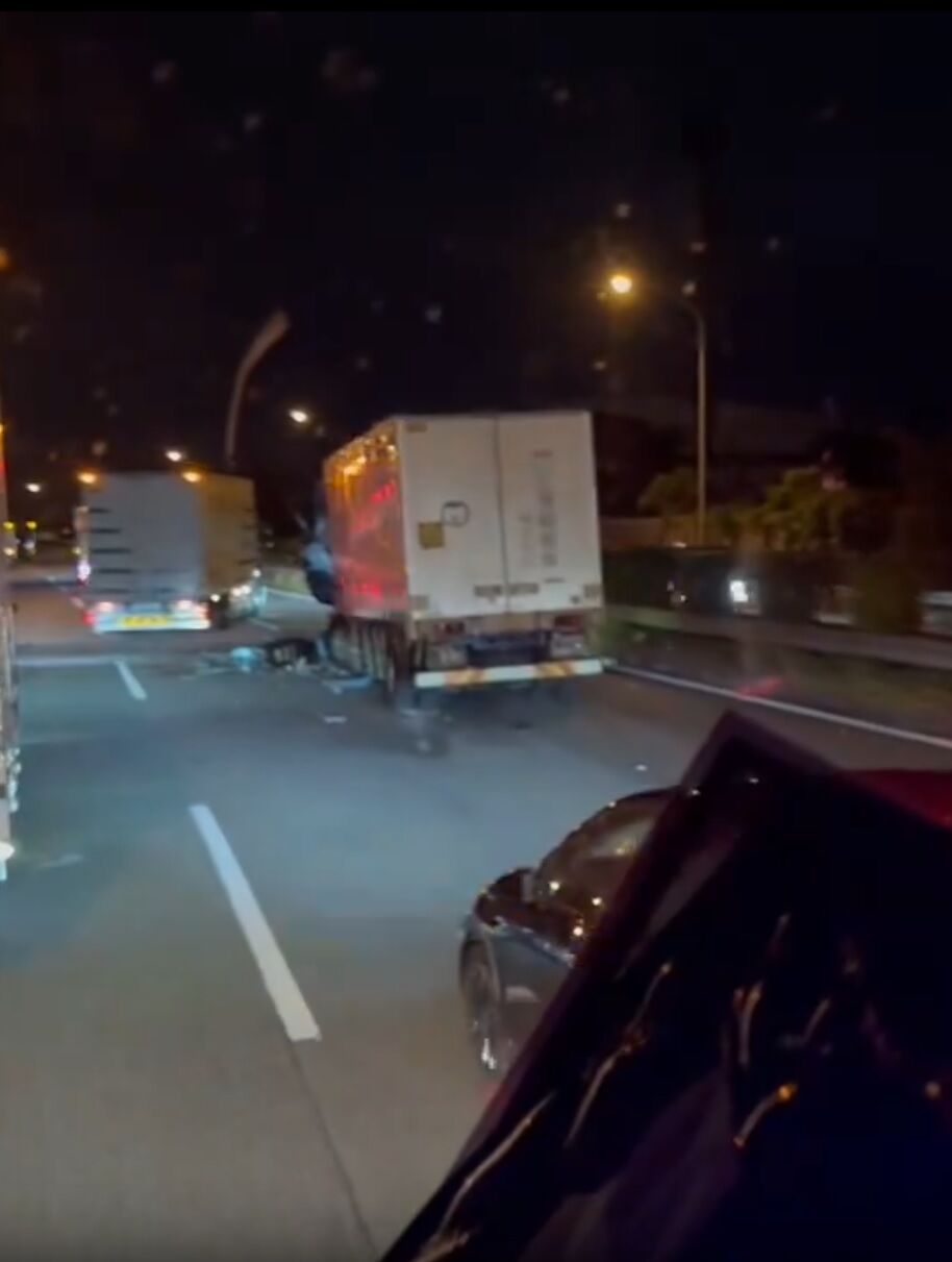 『日本坂パーキングちょい先で、大型数台絡む事故。3車線潰れて、事故処理中。』