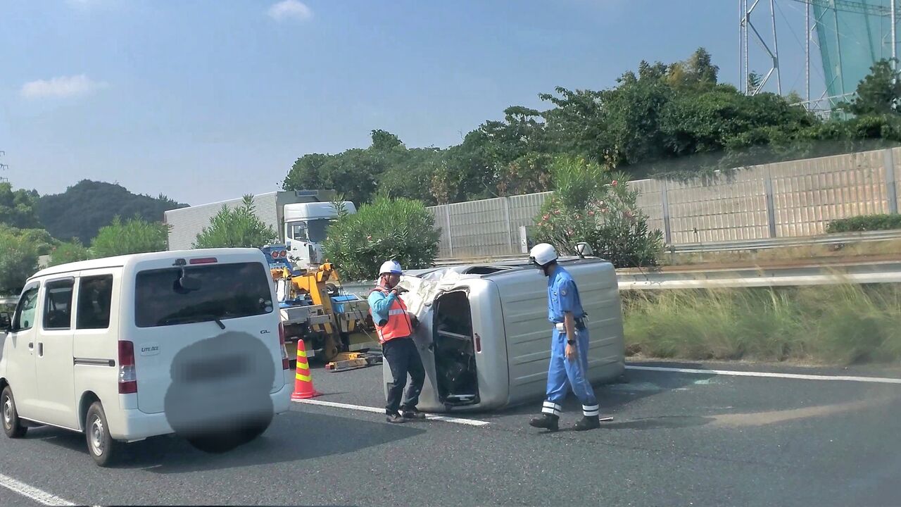 『基山パーキングの先で 軽が一番右車線で横転して塞いでます