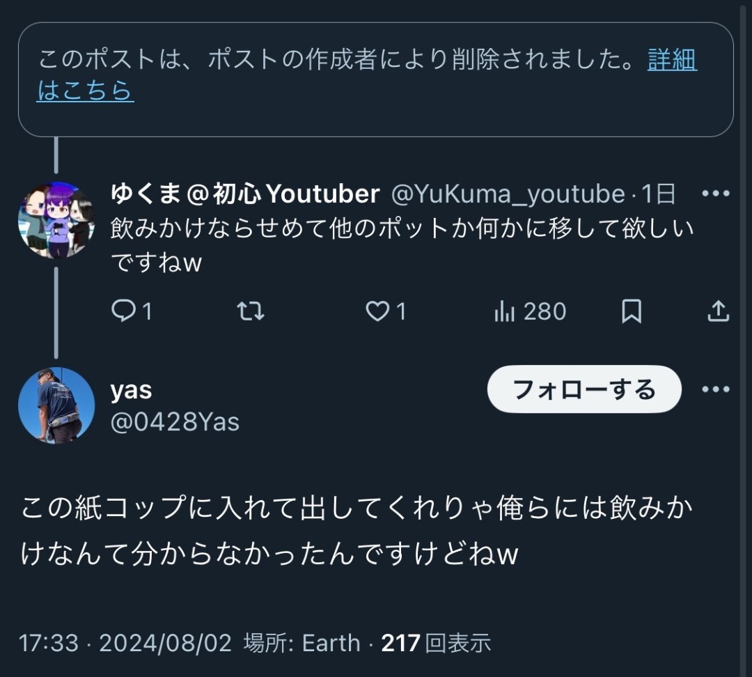 【悲報】植木屋さん、雇い主に飲みかけの麦茶を出されてXに晒す → 勘違いするなと大炎上wwww 2024/8/5 速報 1: https://imgur.com/Hbsx4Ku.jpg — (@YukariAkiyama20) document.write(” + ”); 関連記事 document.write(” + ”); 続きを読む ——— Source: アルファルファモザイク 【悲報】植木屋さん、雇い主に飲みかけの麦茶を出されてXに晒す → 勘違いするなと大炎上wwww