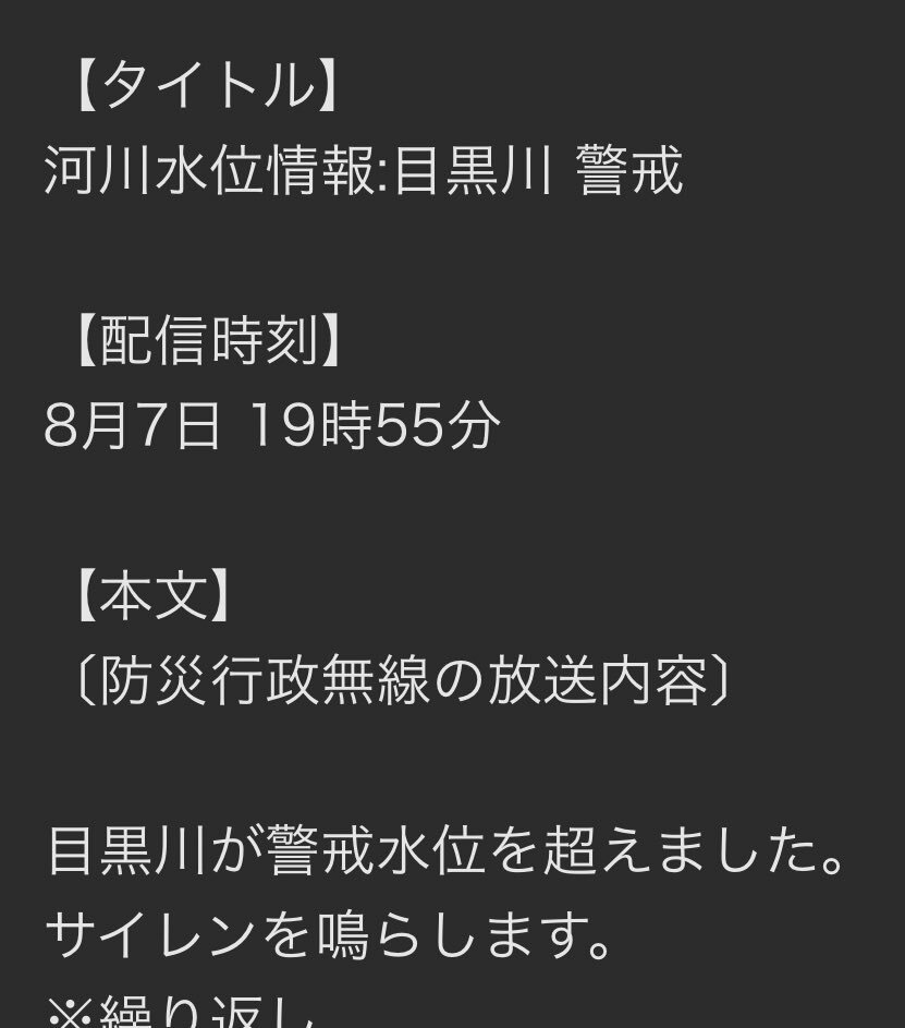 目黒川と立会川河川氾濫警戒警報は携帯アラームなるけど区役所や町内からは初めてかも… pic.twitter.com/mjY9csDbUp