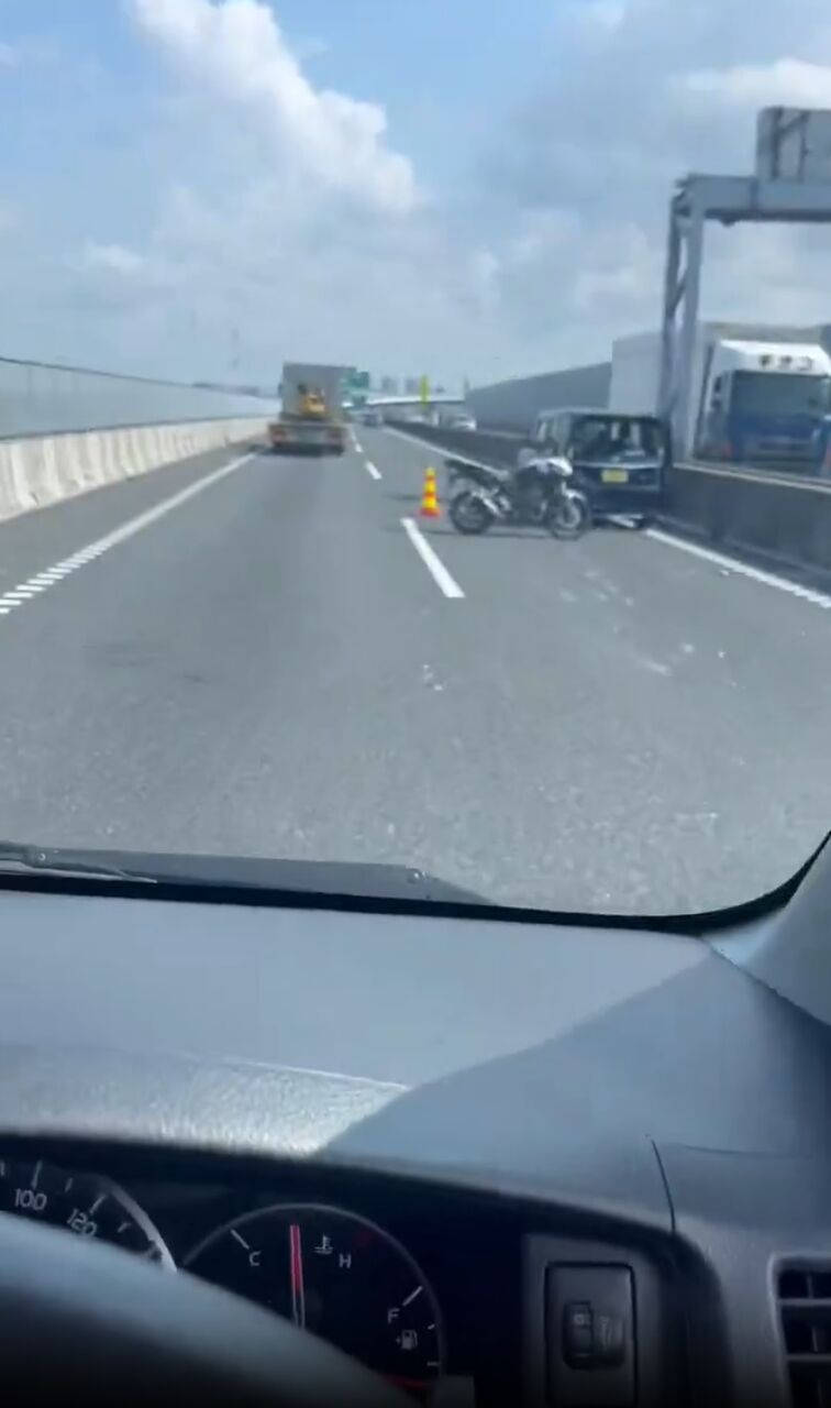 圏央道海老名IC付近で、恐らくバイクが乗用車に追突する事故が発生してた😩