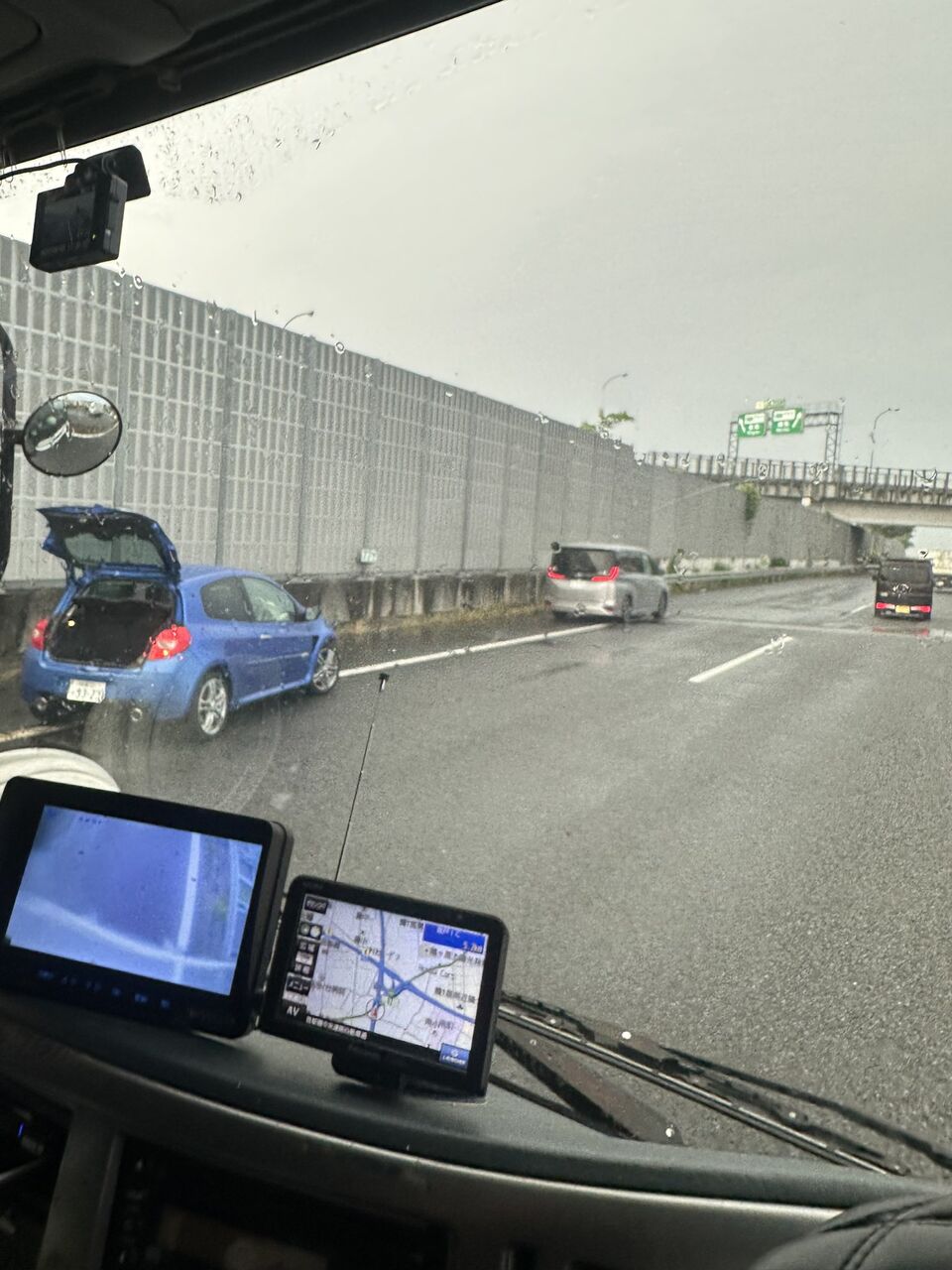 『圏央道外回り、鶴ヶ島JCTで青い車が大破してる。』