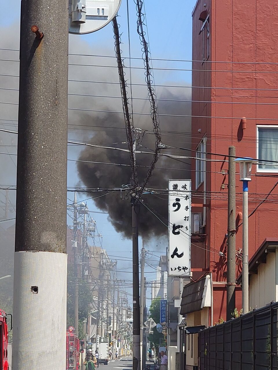 【火事情報】東京都大田区萩中3丁目 マルエツと萩中公園の間付近 道路沿い建物から黒煙あがる火災8月12日 #大田区 #萩中 #火災