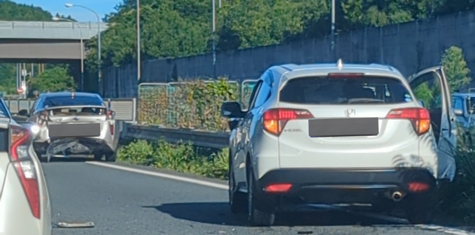 『嵐山小川インターの目の前 追越車線でヴェゼルがプリウスに追突してた 発生直後だったので200mぐらいしか詰まってなかったけど、この後は渋滞するだろうなぁ』