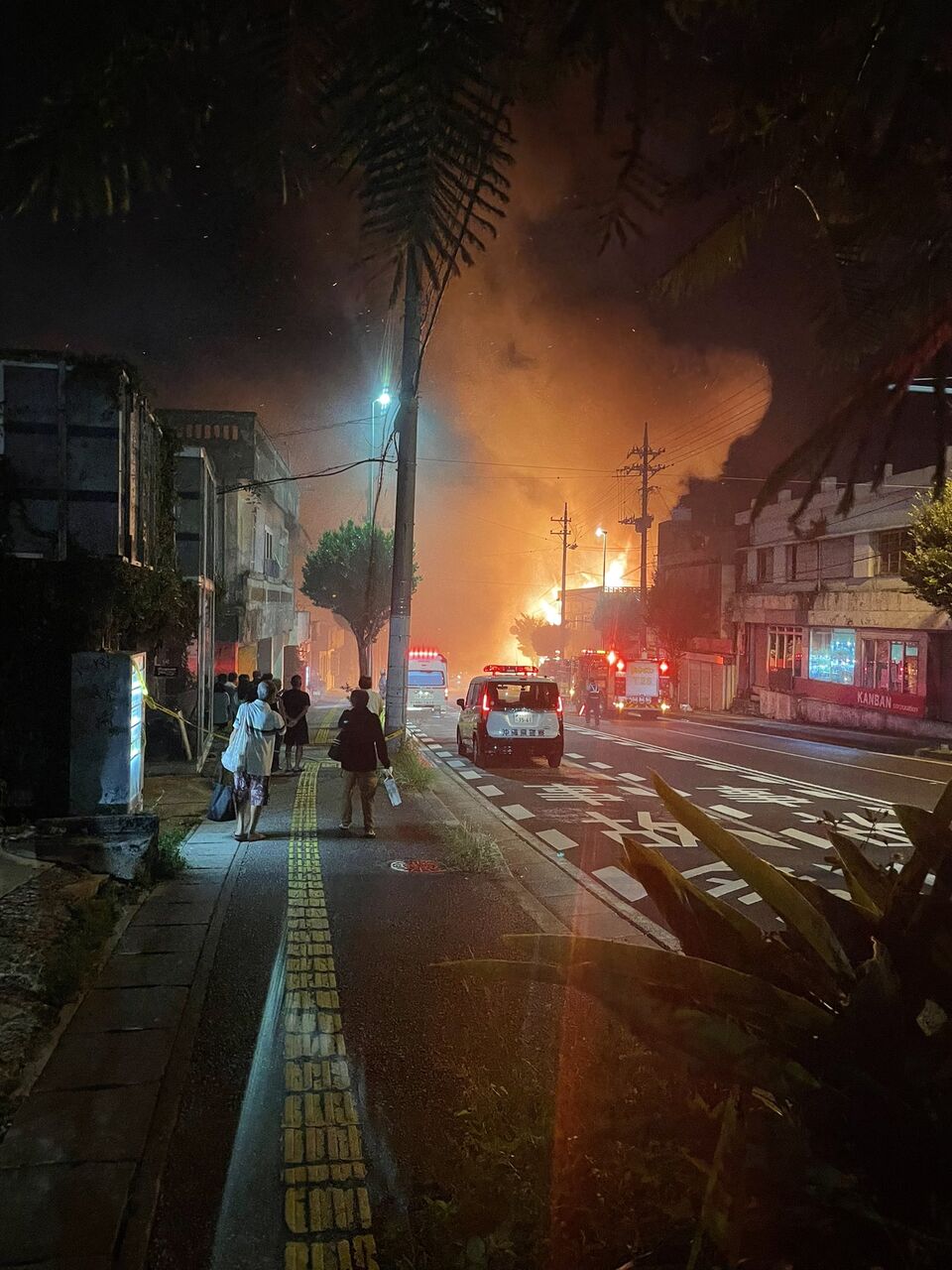 コザ十字路かねひでから胡屋十字路の間、多分通行止めだと思う。目の前の信号機のとこで丁度パトカー来て通行止めになった。結構な火事。 pic.twitter.com/AfQRyO5hgv