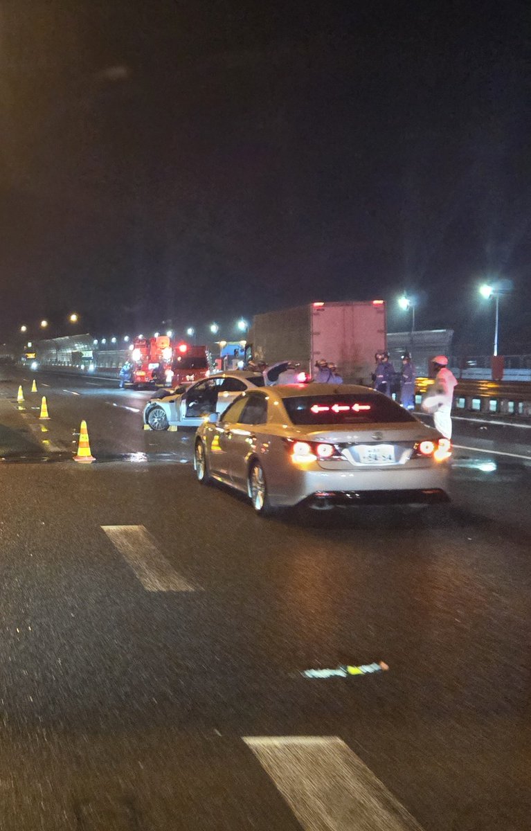 海老名PA上り手前で乗用車とトラックの事故発生してます