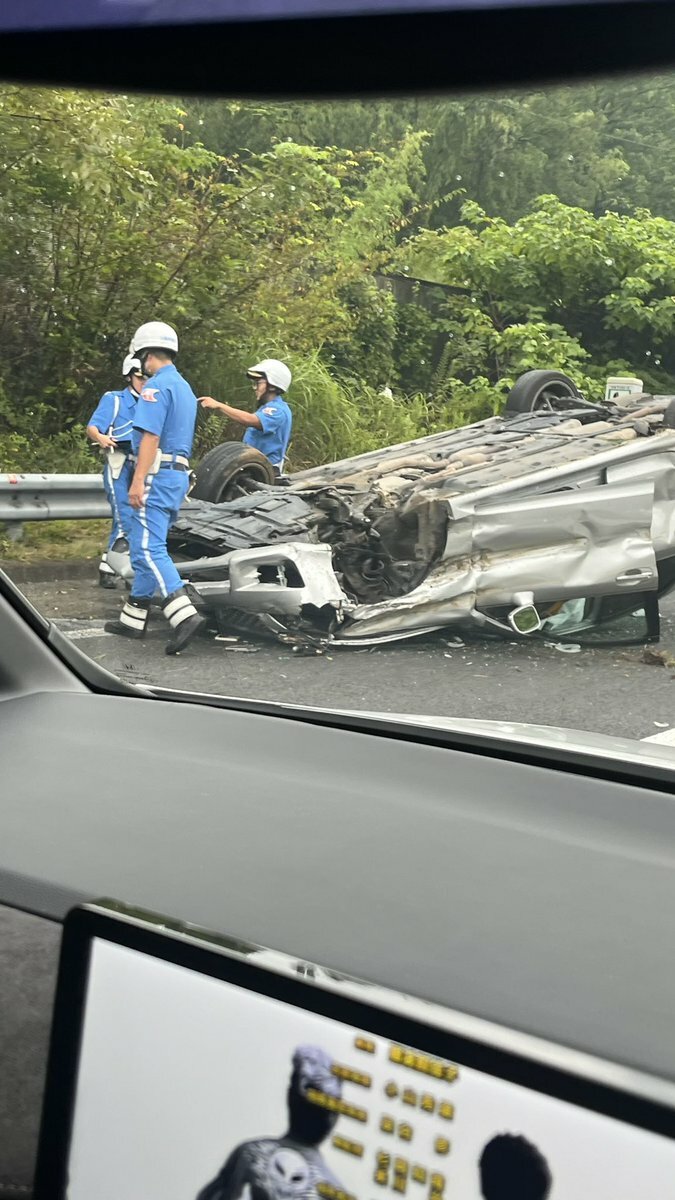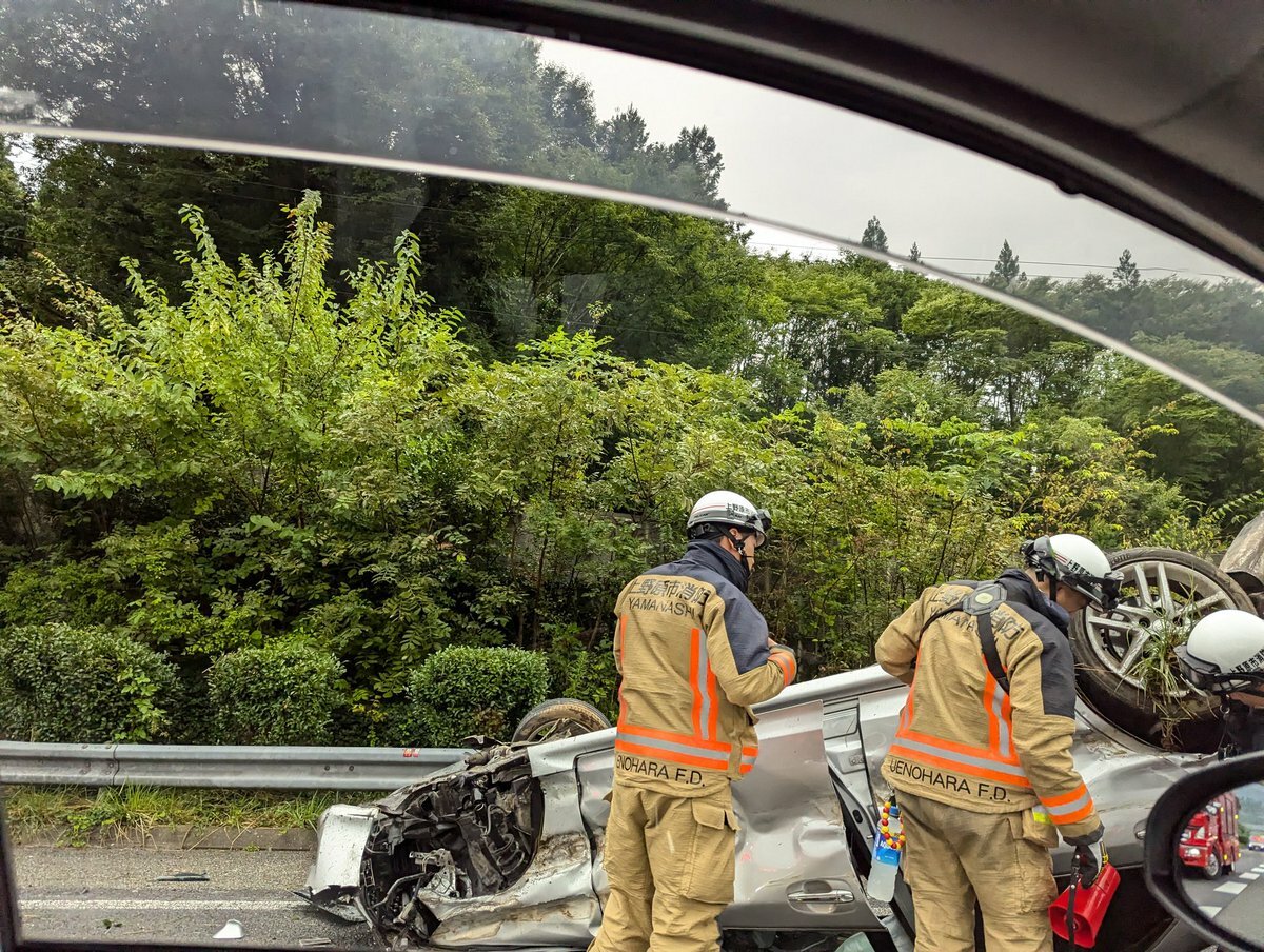 中央道の談合坂手前でセダンが横転してペシャンコになっており大変不安