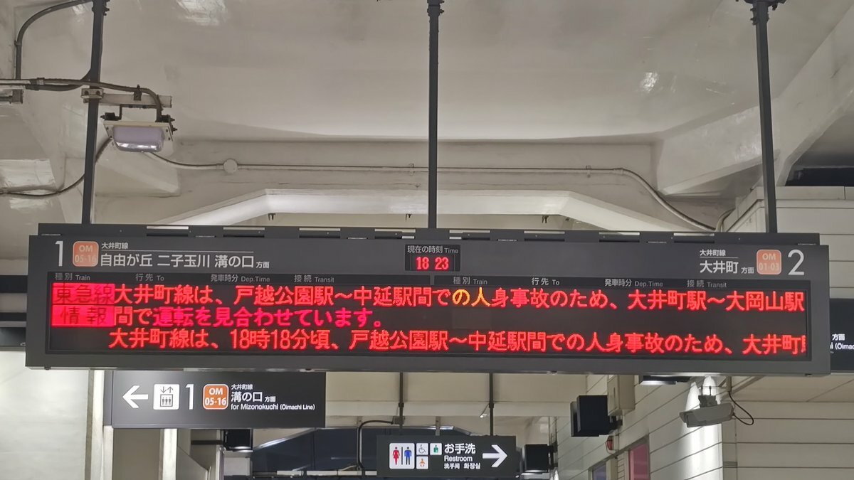 【2024年08月21日 18時21分】大井町線は、18時18分頃、戸越公園駅〜中延駅間での人身事故のため、大井町駅〜大岡山駅間で運転を見合わせています。運転再開は19時50分頃の見込みです。ご迷惑をおかけいたします。お詫び申… https://t.co/PeFxD1dfs8