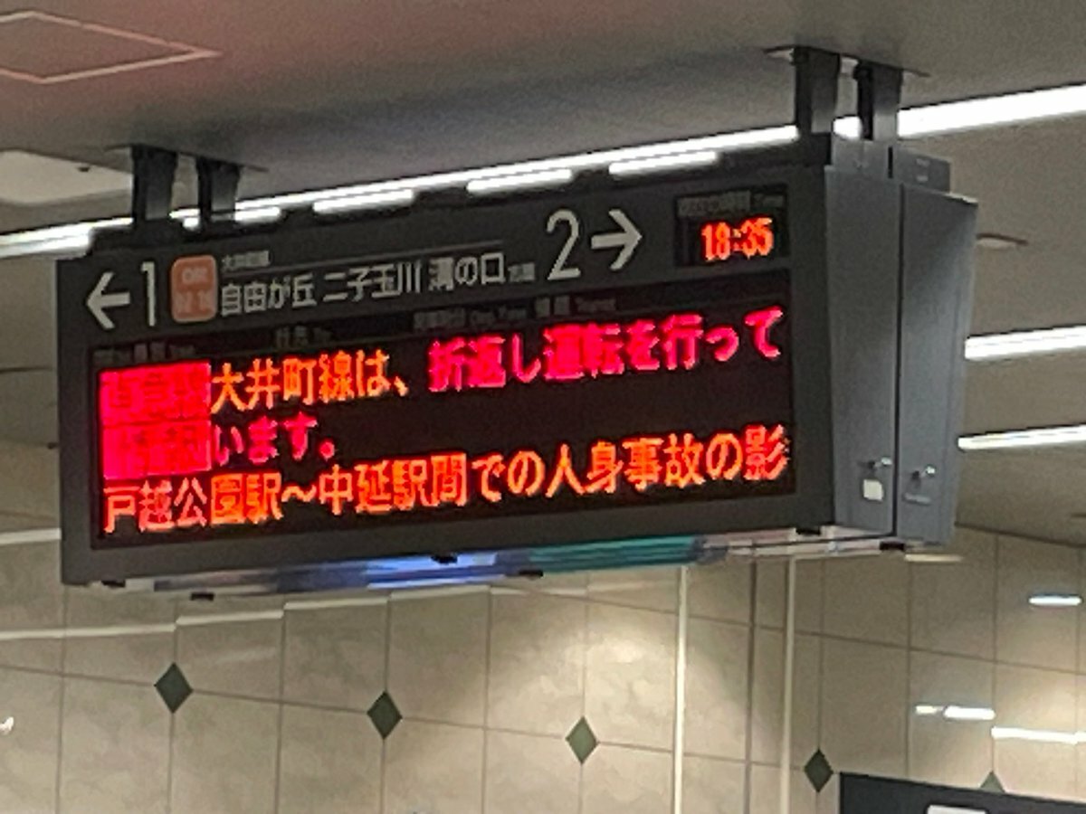【2024年08月21日 18時33分】田園都市線は、18時18分頃、大井町線戸越公園駅〜中延駅間での人身事故の影響により、一部列車に運休が発生しています。大井町線は、18時18分頃、戸越公園駅〜中延駅間での人身事故の影響によ… https://t.co/PeFxD1dfs8
