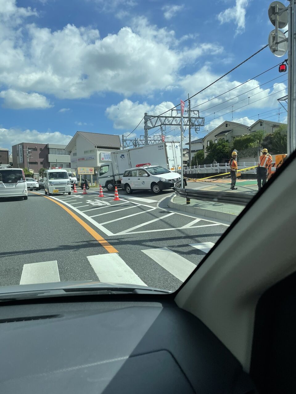 奈良線、踏み切り内にトラックが立ち往生中。今日の予定、早くも大狂い😭エンストしとるんか?