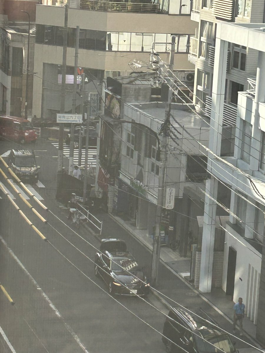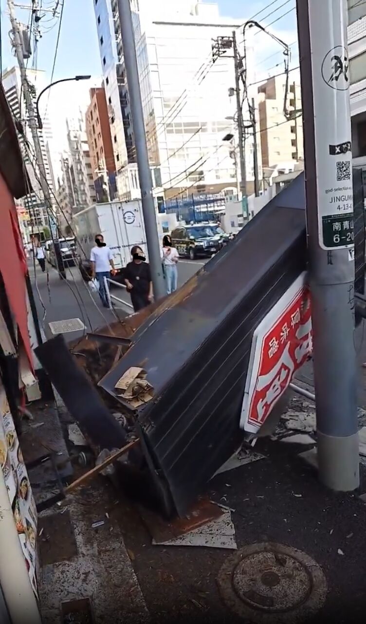 【現場の様子】#交通情報 骨董通り 東京都港区南青山6丁目ラーメン店「威風-IFU-南青山店」付近 建物看板が歩道に落下事故で周辺一部規制8月23日 #港区 #南青山 #ラーメン
