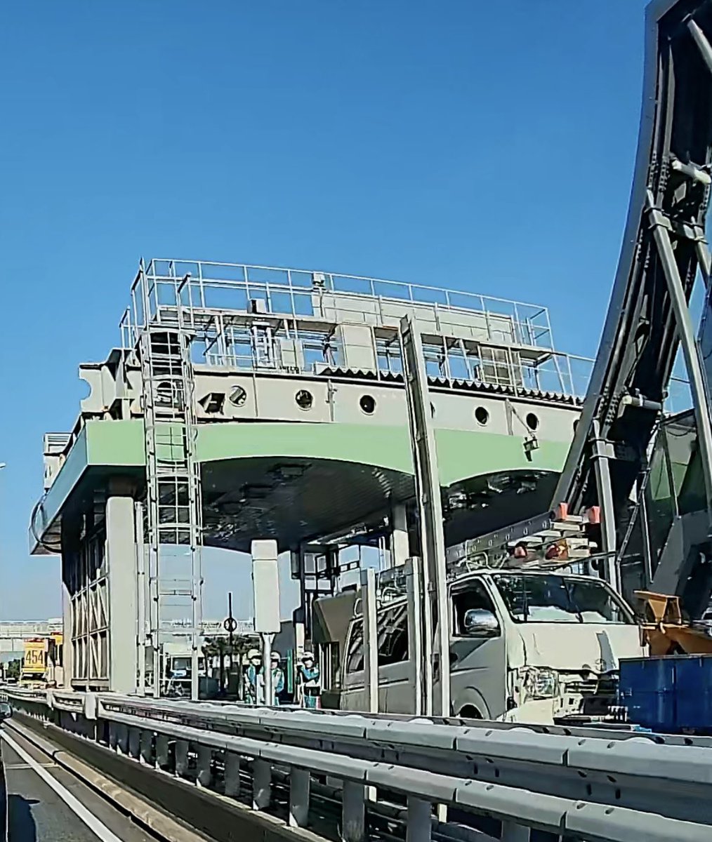 今朝、首都高管理車両が料金所に座刺さってた😅
