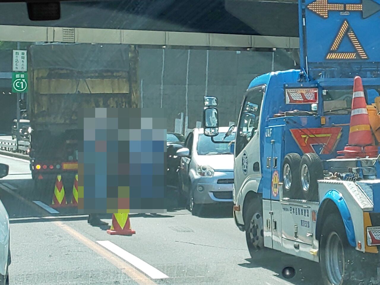 【現場の様子】#交通情報 #首都高 C1都心環状線 内回り 北の丸付近 車線塞ぐ大型トレーラーと乗用車の接触事故で規制渋滞8月24日 #渋滞 #千代田区 #三宅坂 #竹芝