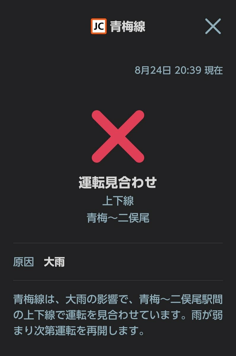 青梅線は、大雨の影響で、青梅〜二俣尾駅間の上下線で運転を見合わせています。雨が弱まり次第運転を再開します。 #青梅線 #Ome_Line https://t.co/Bw82N3lIYZ— JR東日本【中央方面】運行情報 (公式) (@JRE_F_Chuo) August 24, 2024