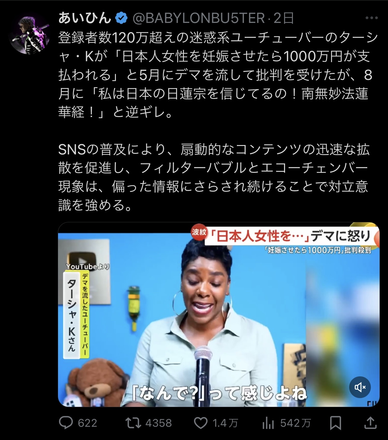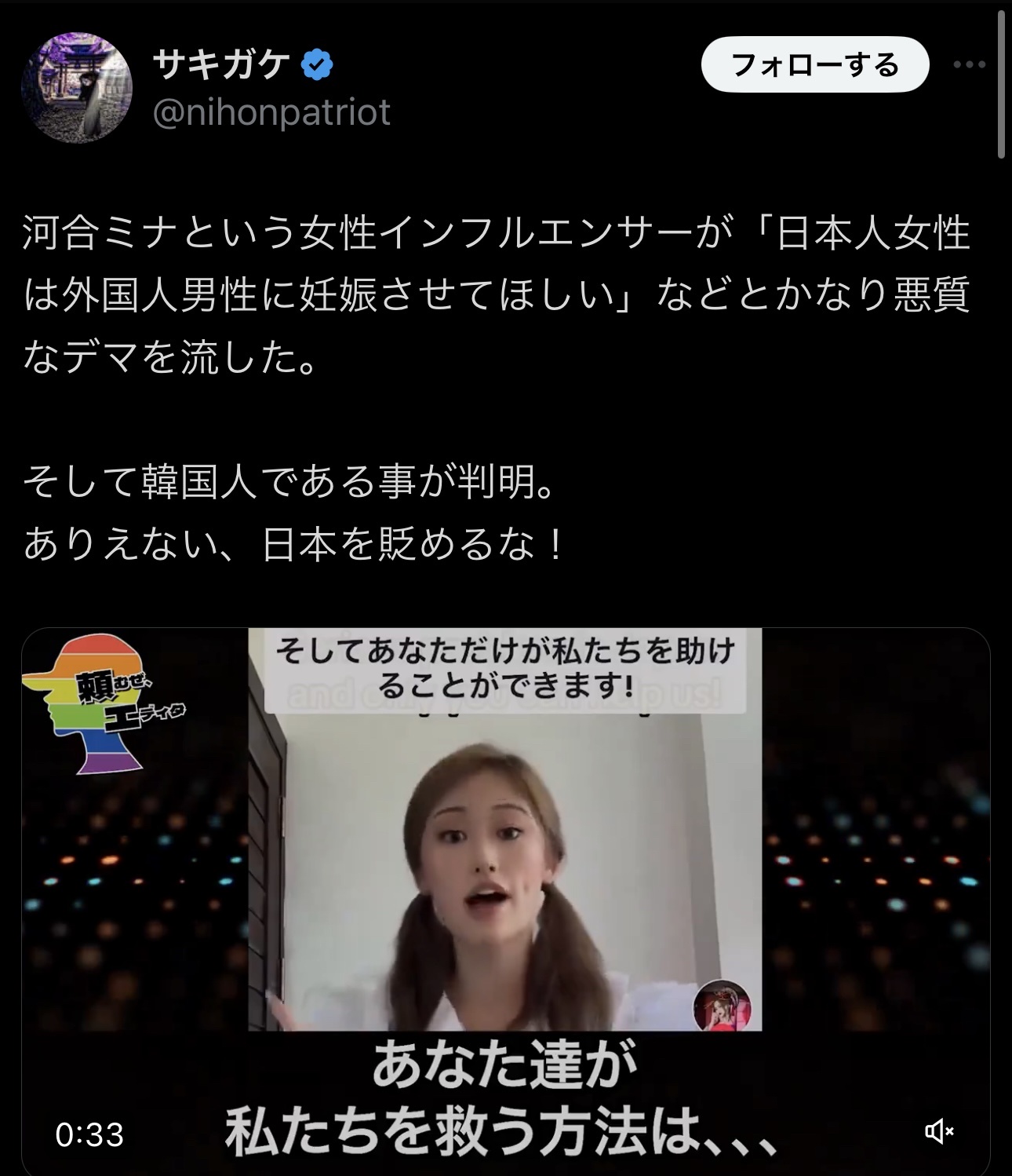 【公開処刑】インフルエンサー女さん「日本人女性たちは外国人に妊娠させて貰いたがってます!」→正体がバレてしまうwwww 2024/8/27 速報 1: https://video.twimg.com/amplify_video/1827298168591282176/vid/avc1/1280×720/Vt6mQDZ8jRWZYGcN.mp4?tag=16 document.write(” + ”); 関連記事 document.write(” + ”); 続きを読む ——— Source: アルファルファモザイク 【公開処刑】インフルエンサー女さん「日本人女性たちは外国人に妊娠させて貰いたがってます!」→正体がバレてしまうwwww