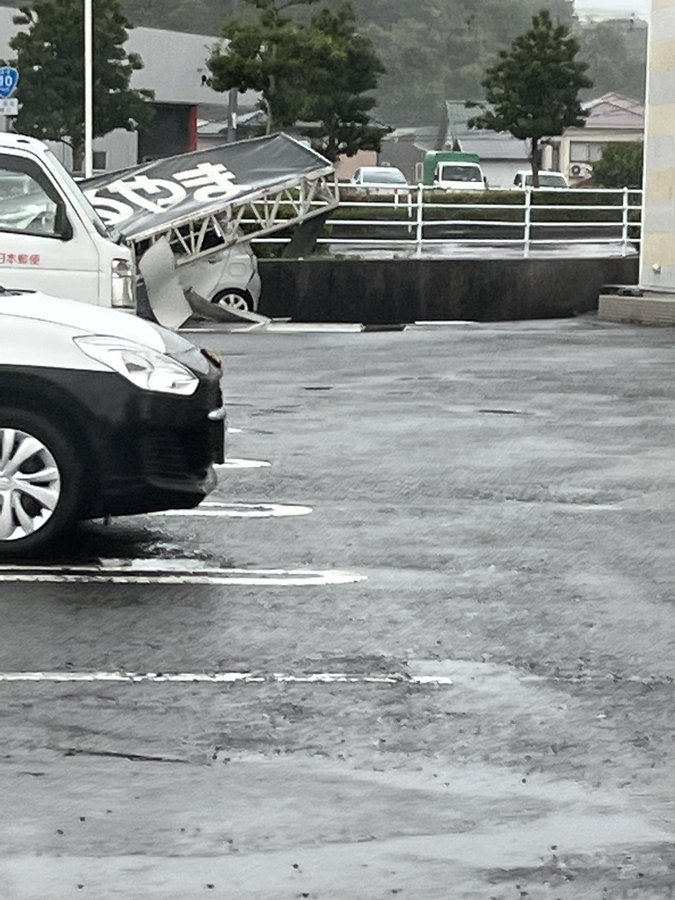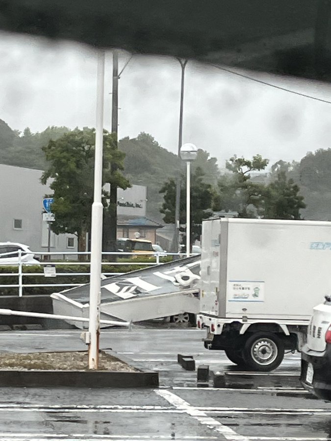 【現場の様子】#交通情報 宮崎西バイパス 宮崎県宮崎市大塚町 はるやま宮崎大塚店の看板が自動車に落下事故8月28日 #宮崎 #台風10号 #強風 #特別警報
