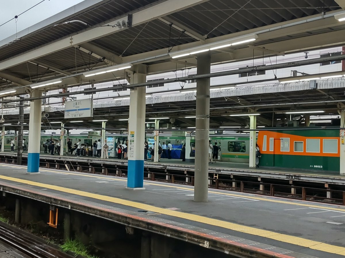 【現場の状況】『ホームにブルーシート貼られてる』#東海道線 藤沢駅で人身事故 #湘南新宿ライン #上野東京ライン など遅延8月29日 #藤沢