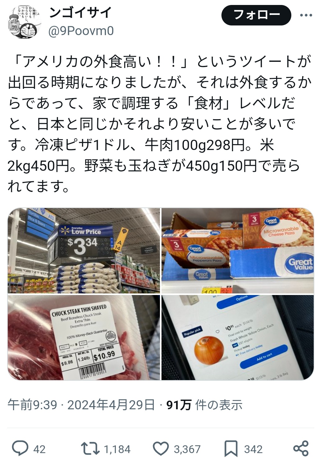 【衝撃事実】アメリカの物価、ガチで狂ってる。最低賃金3000円でコレなんだぜ。。。 2024/9/2 速報 3: 牛肉100g300円 米2kg450円 玉ねぎ450g150円 document.write(” + ”); 関連記事 document.write(” + ”); 続きを読む ——— Source: アルファルファモザイク 【衝撃事実】アメリカの物価、ガチで狂ってる。最低賃金3000円でコレなんだぜ。。。