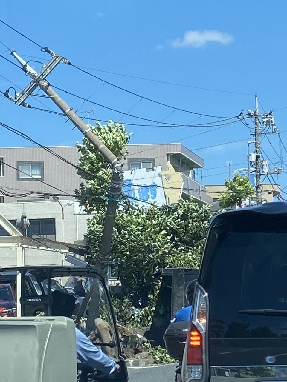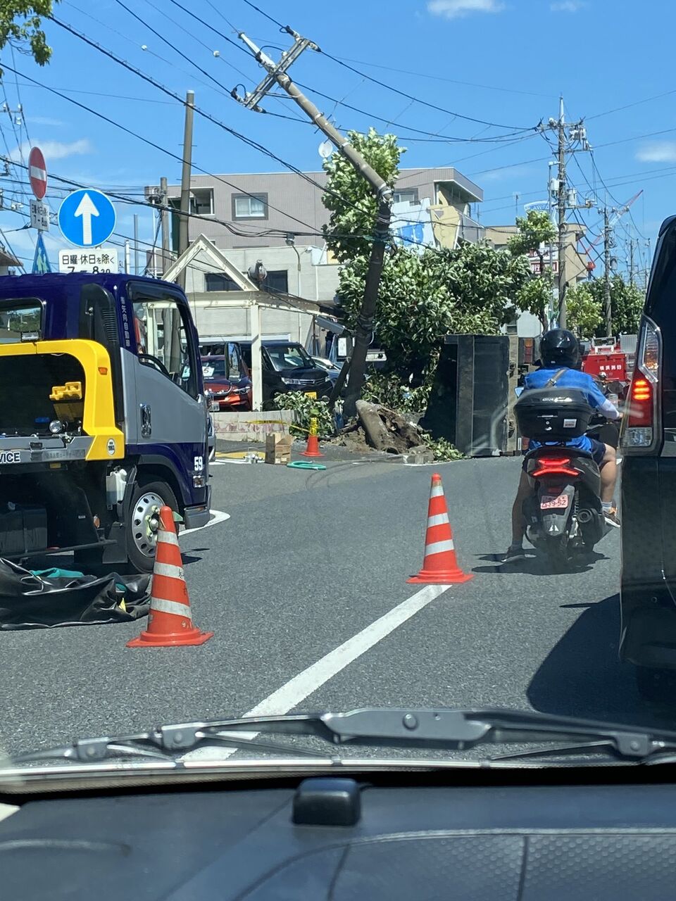 【現場の様子】#交通情報 環状2号線 横浜市港北区師岡町トレッサ横浜西側ローソン付近 電柱折る大型ダンプ横転事故で片側交互通行規制渋滞9月2日 #渋滞 #横浜 #港北区 #環2