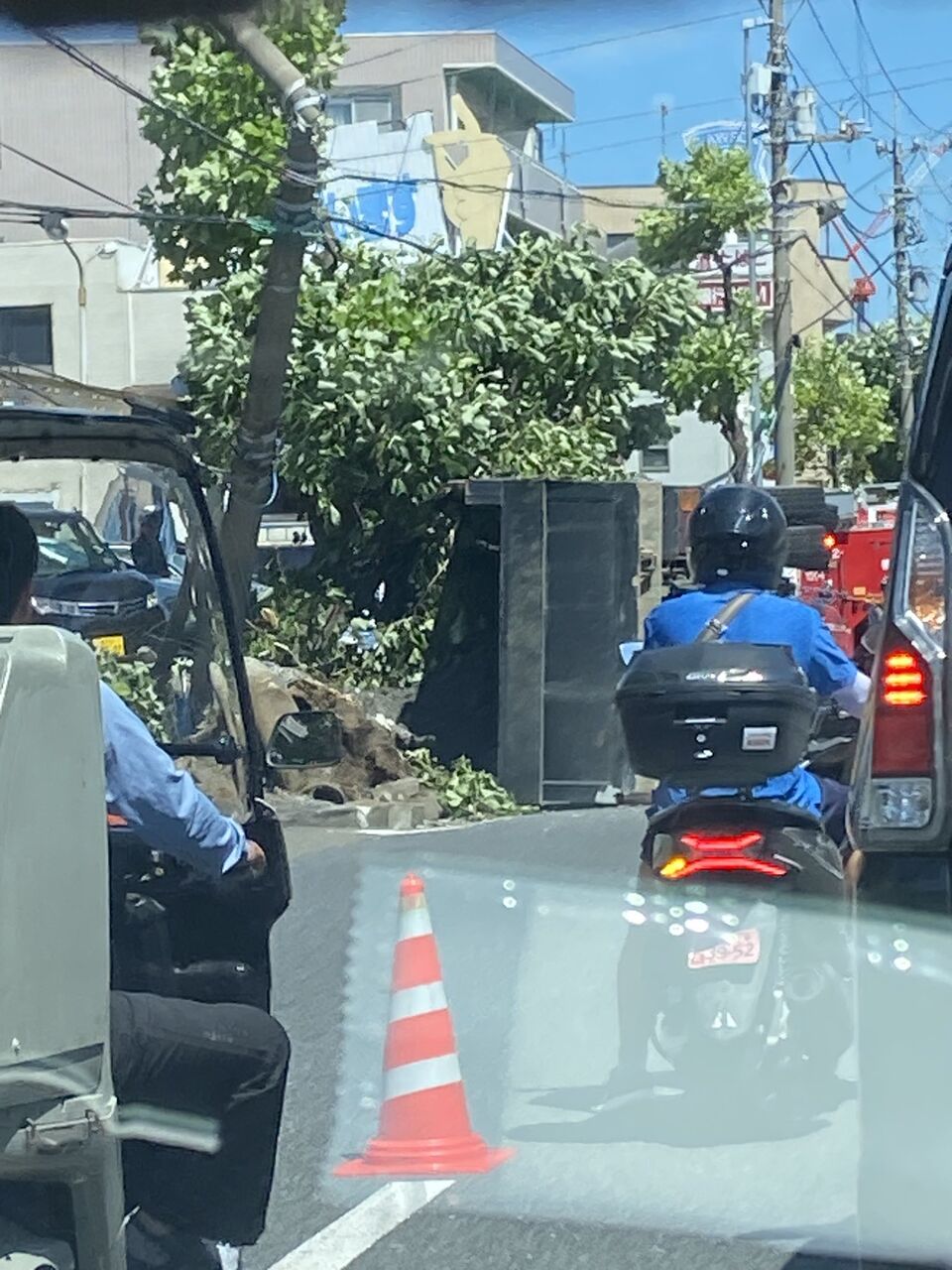 近所ででトラックがひっくり返って片側の車線を塞いでいる。