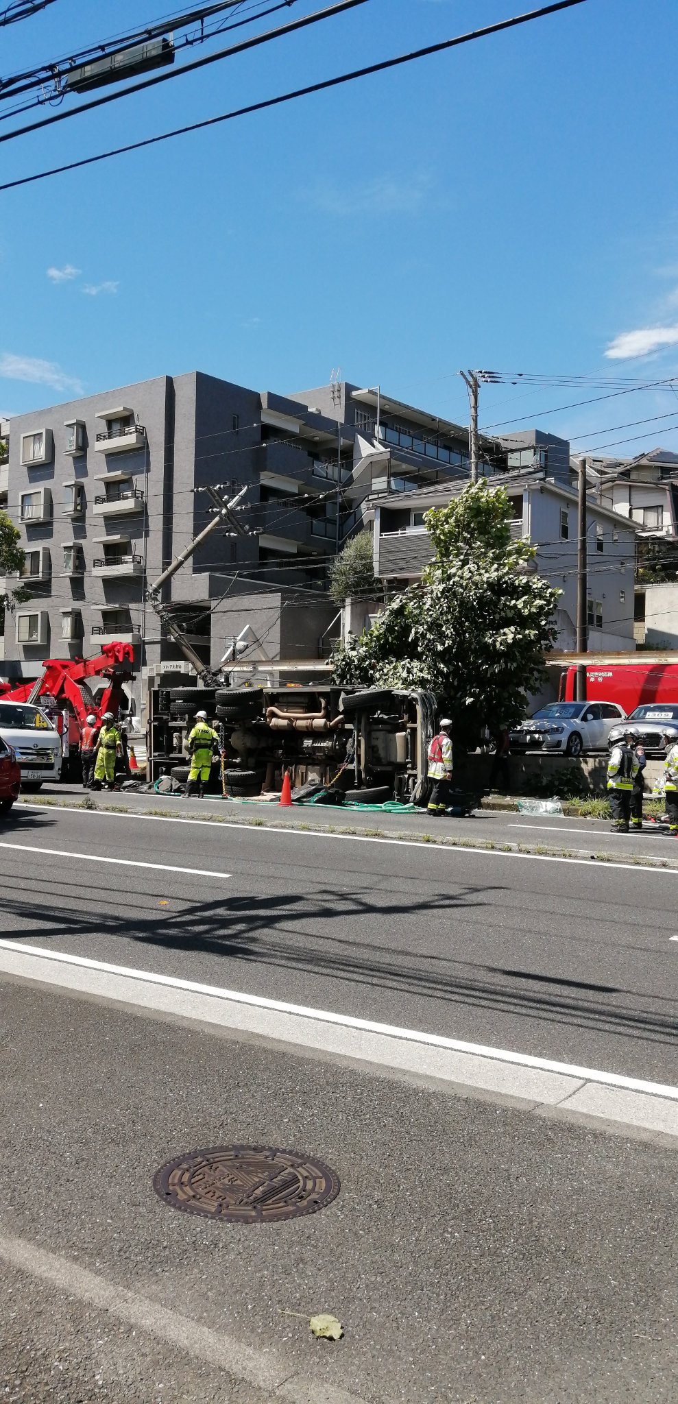 トレッサ横浜近くでトラックの横転事故。電柱折れてる。この区間が通行止めで対向車線と交互に進むため大渋滞発生😱 pic.twitter.com/TKbqjWeBSL