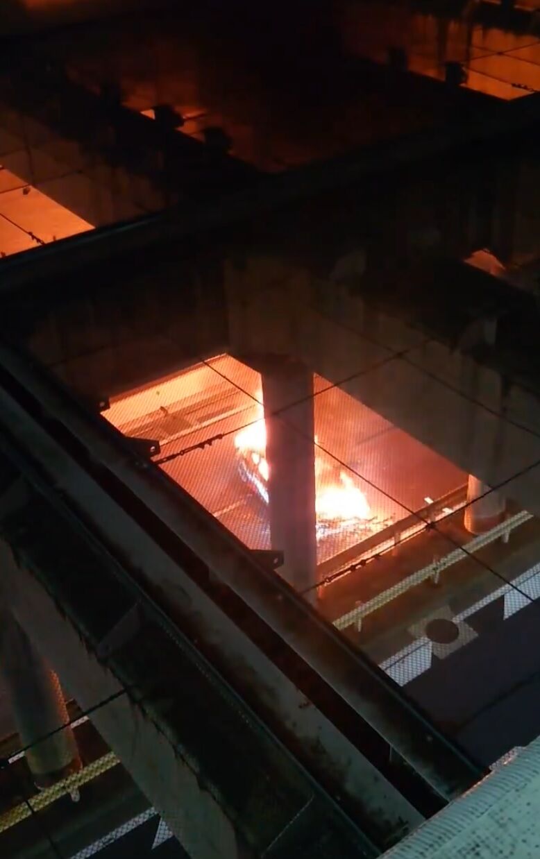 『この赤い車の事故のせいでトンネル内から出れなくなった。 燃えて出た煙吸い込み喉がめちゃくちゃ痛い。