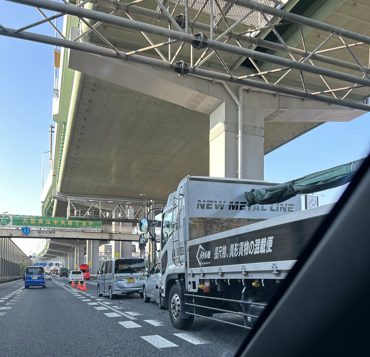 『大高IC近くのオービス下で大型絡む4台ぐらいの玉突き事故