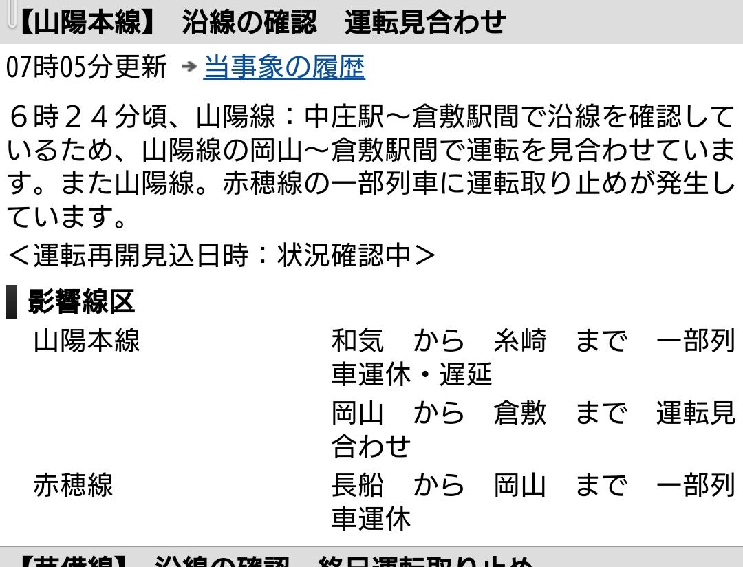 9月7日7時5分現在: 6時24分頃、山陽線:中庄駅〜倉敷駅間で沿線を確認しているため、山陽線の岡山〜倉敷駅間で運転を見合わせています。また山陽線。赤穂線の一部列車に運転取り止めが発生しています。 #JR西日本 #山陽本線 #赤穂線 https://t.co/127SM3oWHk