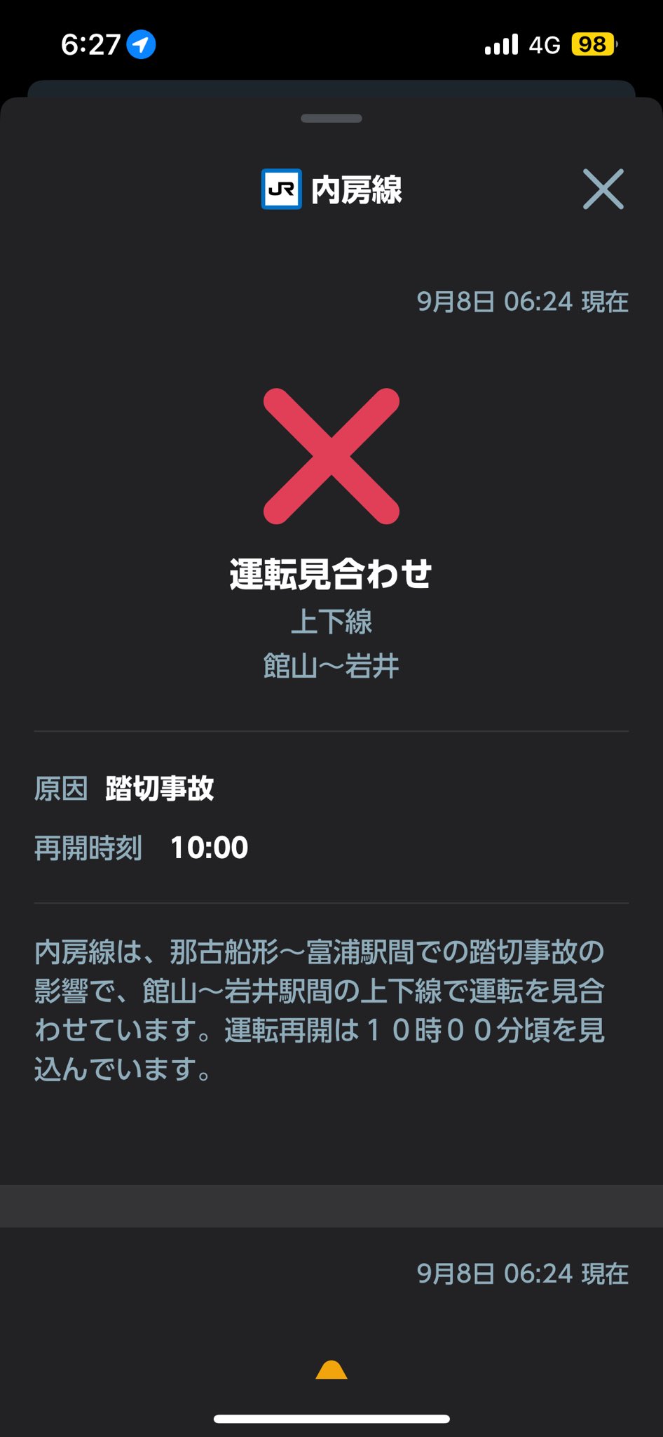内房線は、那古船形〜富浦駅間での踏切事故の影響で、館山〜岩井駅間の上下線で運転を見合わせています。運転再開は10時00分頃を見込んでいます。 #内房線 #Uchibo_Line https://t.co/dJGOmYnTuK— JR東日本【総武方面】運行情報 (公式) (@JRE_F_Sobu) September 7, 2024