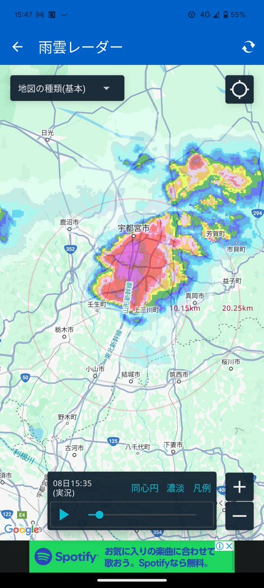 関東北部の雨雲が発達し、栃木県宇都宮市で激しい雨が降りました。